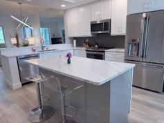 Inside, the open-concept floor plan features a bright, fully remodeled kitchen with ample counter space and natural light, perfect for entertaining while staying connected to the living area and enjoying views of the course. The primary bedroom includes a king-size bed, walk-in closet, golf course view, and an en-suite bathroom with a walk-in shower. A cozy guest room with a queen bed, in-unit washer/dryer, and a convenient carport just steps from the front door complete the package.