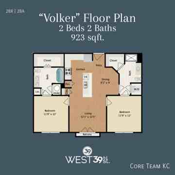 Discover the perfect blend of style and functionality in the Volker floor plan at West 39th Street Apartments. This 2-bedroom, 2-bathroom apartment spans 923 sq. ft., featuring walk-in closets, Juliette balconies, and exposures that fill your home with natural light. Units offer either south or north views, providing a serene backdrop to your daily life.