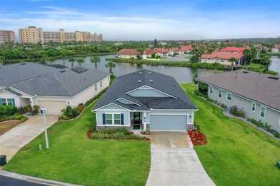 NO SHOWINGS UNTIL 02/15/2026 - Register and Schedule your prospects between now and then . Delivered UNFURNISHED. Move-in Ready - Welcome to 13 Las Brisas Way, nestled in the desirable Beachside Los Lagos community. This stunning, nearly-new lakefront home, still under Builder's warranties, offers the perfect blend of modern elegance and comfort. As you step inside, you'll be captivated by the expansive, open floor plan with soaring ceilings, stylish downlighting, freshly painted interior walls and elegant wood plank tile flooring. Sliding barn doors lead to a versatile Flex room that can serve as a home office, workout space, or even a fourth bedroom with the addition of an Wardrobe or Armoire. The heart of the home is the kitchen, featuring sleek grey cabinetry, soft-close drawers, and a contemporary white quartz countertop with a striking herringbone backsplash. Equipped with top-of-the-line stainless steel appliances—including a built-in microwave, oven, and a convenient cooktop with a stainless steel vented hood—this kitchen is designed for gourmet cooking. A spacious island with a built-in dishwasher, sink, and overhang for casual dining is illuminated by stylish pendant lighting. Natural light floods the open living area through east-facing windows, enhancing the ambiance of the space. The living area seamlessly extends to a covered, screened lanai with breathtaking lake views. Here, you’ll find a state-of-the-art Jacuzzi, perfect for relaxing with a drink while enjoying the serene lakeside setting. The lanai also offers ample space for lounging, watching TV, or adding a summer kitchen. The primary bedroom is a tranquil retreat, featuring a private entry hallway, tray ceiling, and a large lake-view window. The luxurious ensuite bathroom boasts double vanities with sleek black fixtures, a private water closet, and a spacious walk-in shower with clerestory windows, a bench, rain shower head, and handheld wand. Two additional guest bedrooms share a well-appointed guest bath. The interior laundry room is both functional and stylish, with a storage shelf, cabinetry, white quartz countertop for folding, and a front-load washer and dryer, along with a mini top-load washer for delicate items. Completing this exceptional home is a 2-car garage with a tandem storage area. Enjoy the best of beachside living with access to sunrise views, the Intracoastal waterway for fishing and kayaking, or relaxing on the covered boat dock. For those seeking adventure, the community offers sand volleyball, tennis, pickleball, and a beachside pool by the ocean. This is more than just a home—it's a lifestyle. Don’t miss the opportunity.