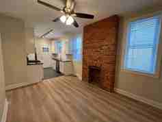 This 1st floor apartment has a covered front porch with private entrance, hardwood floors, ceiling fans, and new windows. There are separate living and dining rooms, each with a decorative exposed brick fireplace. The galley kitchen features granite counters, subway tile backsplash, custom cabinets, track lighting, garbage disposal, and stainless-steel appliances including dishwasher, built in microwave, gas stove, and refrigerator with ice and water dispenser in the door. The bathroom has a full-size tub with inlaid tile surround, vanity with basin sink, and a dimmable LED mirror with anti-fog.