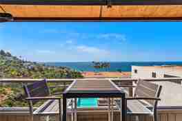 Enjoy panoramic ocean, sunset and coastline views from this uniquely situated back row end unit, bordering nature preserve. Remodeled upgrades throughout include custom etched glass double front door entry, living room with granite surround fireplace, media built-ins with surround sound wiring, and slider to ocean view deck with electric awning. Kitchen boasts granite countertops with bar seating, custom cabinetry, and high-end stainless steel appliances. A formal dining room, den/office with built-in desk, and a powder room complete the upper level. The master suite features a gas fireplace, custom closets, and newly renovated en suite bath. Second bedroom with scenic hillside view also has its own en suite remodeled bathroom. With upgraded dual paned slider & windows throughout, this end unit also enjoys unique side windows for enhanced natural light and an open feel. A finished bonus room on the lower level connects to the direct access two car garage with ample storage space. Located in the exclusive gated community of Laguna Ocean Vista with private pool, clubhouse, and within blocks of Laguna’s renowned beaches, shops & the Montage Resort!