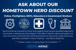 Second Avenue is proud to offer the Hometown Hero Leasing Discount Program to honor and support local heroes, including police officers, firefighters, emergency medical personnel, educators, and government employees. Eligible participants who are fully approved for a lease will enjoy a reduced security deposit on their Second Avenue home. This offer cannot be combined with other promotions or discounts unless otherwise specified. Available in Select Markets - Ask About Eligibility.