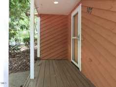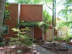 This duplex style end unit townhome is in the Whispering Hills neighborhood of Carrboro; convenient to Carrboro, UNC and Highway 54. The home features brick flooring and exposed beam ceilings on the main level. The living and dining areas combine in a spacious room with a wall of windows for natural light. The living area includes a wood stove, a ceiling fan, and one of the two motel style (PTAC) ac/heat unit. A glass slider leads out from the dining space to the patio in back. The dining area is open to the kitchen. The updated kitchen features granite counters, glass front cabinets, and a pantry closet. Kitchen appliances are included. There is a double door coat closet and an under stairs storage closet on the entry foyer. Carpeted stairs lead up to the second level. The second ac/heat unit is on the upper stairway. The bedrooms, bathrooms, and laundry are on the second level. Both bedrooms feature wood-look flooring and ceiling fans. The master bedroom has a walk-in closet through to a private bathroom. The second bedroom has a double door closet and is convenient to the second bathroom. Both bathrooms have updated fixtures and a tub-shower. The laundry nook is on the hallway and includes a washer and dryer. The second ac/heat unit is on the upper stairway. There are two parking spaces in front of the unit. Pet with fee and prior approval. $15/mo filter fee.