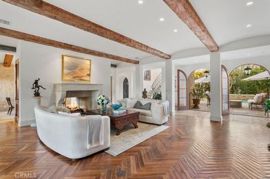 The interiors unfold through a light-filled, open-concept floor plan that seamlessly connects the main living spaces, all framed by a lavish pool and garden setting. Designed for both effortless entertaining and quiet retreat, the living and dining areas exude warmth, scale, and polish. At the heart of the home, the chef’s kitchen is equipped with top-tier appliances and custom cabinetry, flowing naturally into the surrounding gathering spaces—perfect for summer evenings spent indoors or out.