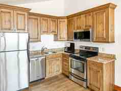 Vaulted ceilings and rich hardwood floors give the living areas an airy, mountain lodge feel, while plush carpet in the bedroom keeps things warm and cozy underfoot. Radiant heat throughout keeps your feet warm, no matter how cold it gets outside. A gas-burning fireplace and a large 65” Smart TV make for the perfect après-ski wind-down.