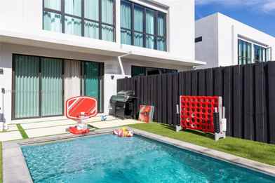 Live the tropical lifestyle in this vibrant, Cuban-inspired 3-bedroom, 2.5-bath fully furnished rental home. Thoughtfully designed with bold colors, tropical motifs, and lush greenery, this home blends comfort with character. The spacious open layout features a cozy lounge, statement decor, and a dining area that flows seamlessly outdoors. Relax in the private backyard oasis with a glowing pool, lounge chairs, string lights, and a shaded cabana perfect for entertaining. Located in the heart of Miami, just minutes from top dining, nightlife, and cultural hotspots, this home is the perfect island escape in the city