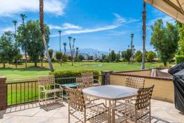 Welcome to this beautifully maintained 2-bedroom, 2-bathroom home with a den, located in a prime golf course setting offering sweeping views of lush fairways and the surrounding mountains. The spacious interior features an open living and dining area with vaulted ceilings, a cozy fireplace, and expansive floor-to-ceiling windows that fill the space with natural light and showcase the picturesque landscape beyond. The kitchen is both functional and elegant, with abundant cabinetry, granite countertops, double ovens, and a charming breakfast area that opens directly to the outdoor patio. Ideal for both relaxation and entertaining, the extended back patio provides a serene setting overlooking the golf course and a nearby water feature, while the private entry courtyard offers a warm and inviting welcome. The primary bedroom suite features a generous layout and a walk-in closet, offering comfort and privacy. The second bedroom is bright and spacious, perfect for guests or family members, with convenient access to the second full bathroom. A versatile den provides the perfect space for a home office, media room, or additional sleeping area. This home blends timeless design with an unbeatable location, ideal for enjoying the comfort and beauty of desert living.