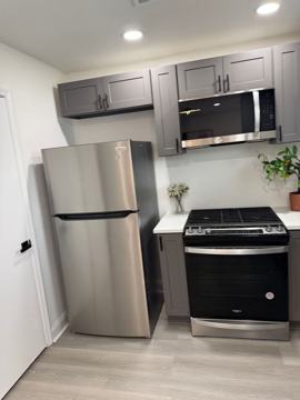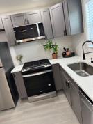 - A fully equipped kitchen with a gas range, dishwasher, microwave, and refrigerator