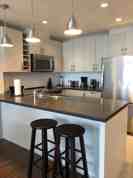 - Contemporary kitchen with stainless steel appliances, quartz countertops, and ample storage