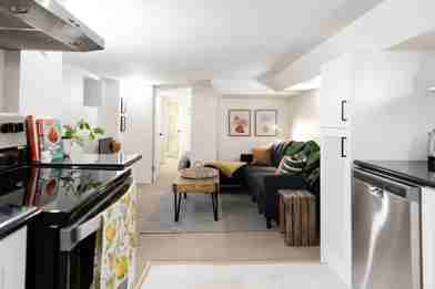 Kitchen: Open-concept kitchen with ample cabinet storage, full-sized appliances (fridge, stove, microwave, dishwasher), sleek countertops, and good lighting.