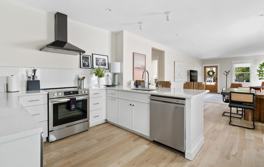 Inside, you’ll find a spacious, open-concept layout filled with natural light. White oak hardwood floors, curated furnishings, and smart electronic dimmers create a warm and sophisticated atmosphere. The living area includes a 60" smart TV and flows effortlessly into a dining area and a modern kitchen outfitted with stainless steel appliances, quartz and natural stone countertops, a peninsula with barstool seating, a pantry cabinet, and a coffee maker with all the essentials.