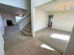 Spacious home featuring a cozy living room with a corner wood-burning fireplace and a well-equipped kitchen offering ample counter space, abundant cabinets, and a walk-in pantry. The kitchen includes all electric appliances, an eat-in dining area, plus a separate formal dining room perfect for entertaining. The split floor plan places the primary suite downstairs with a private bath featuring a double vanity, garden tub, separate shower, and an oversized walk-in closet. Upstairs you’ll find additional bedrooms, a full bathroom, and a loft overlooking the foyer—ideal as a second living area. Enjoy the covered back patio and privacy-fenced backyard. Pet friendly per policy with deposit.