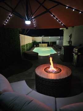 Relax outside in the pool with night lights, a waterfall, and a fire table.