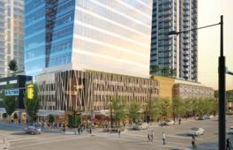 It features desired lifestyle amenities including a rooftop sky pool and lounge, social BBQ and lounge areas, bocce lanes, gardens, fitness facility, and co-working spaces.