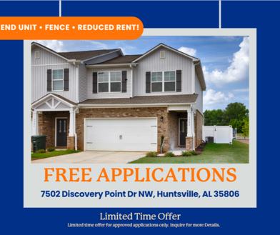 Charming 2024 built end-unit townhome in a prime location just minutes from Downtown Huntsville! Fully equipped with all appliances included and neutral finishes throughout, this blank slate is ready to become the home you have been dreaming of. The functional floorplan features a combination living and dining area perfect for both entertaining and everyday living. Your home chef never has to miss a moment in the modern kitchen featuring granite countertops, stainless steel appliances, a breakfast bar, and sightlines into the great room. A large patio in the privacy fenced backyard extends your living space outdoors and provides a comfortable space for living or dining al fresco! Unwind after a long day in the serene master suite boasting a walk-in closet and full private bathroom with everything you need to relax and recharge after a long day. You don't want to miss this one, schedule your showing today!