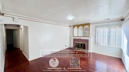 This charming single-story residence is thoughtfully designed with three bedrooms, including a large primary bedroom, and two full bathrooms. The heart of the home is a combined kitchen and living room area, featuring rich wood cabinetry, modern appliances, and a classic brick fireplace that serves as a focal point. Throughout the house, warm-toned hardwood floors create a welcoming atmosphere, complemented by crisp white walls that brighten the space. Large windows in the bedrooms allow for ample natural light, while decorative valances add a touch of elegance. The bathrooms are well-appointed, with one featuring a sliding glass shower door and the other a full bathtub-shower combination. The kitchen's diagonal tile flooring adds visual interest, contrasting nicely with the dark wood cabinetry and black appliances. Crown molding in some rooms adds a refined touch to the overall design. With its practical layout and inviting features, this home offers a comfortable living environment in a desirable location.