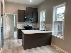 Contemporary kitchen with sleek dark cabinetry, quartz countertops, subway tile backsplash, and stainless steel appliances — perfect for cooking and entertaining.