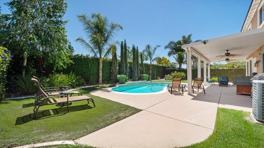 Resort-Style Backyard: Sparkling saltwater pool with cascading waterfalls.