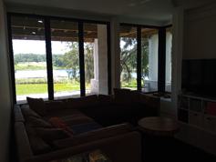 The Lake Cloister is a new private home in Gotha, Florida, designed in a Frank Lloyd Wright style, blending organic architecture with serene lakefront surroundings. The WEST Wing accommodation is a fully private suite within the main home, offering a private entrance for convenience and seclusion.