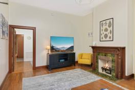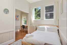 High ceilings with architectural touches, large living room, full kitchen w/ dining table. Queen bed in bedroom and open connected room w/ desk / twin bed. Sleeper sofa in living room. Easy parking in front.