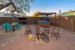 The house features two well-appointed bedrooms and a single bathroom, perfect for individuals or shared living. Bedroom 2 is the ideal in-home office with a designated workspace and a standing desk that offers versatility in standing or sitting. Monitor with a camera for Zoom meetings and a keyboard. Comfortable living room with a sectional couch as well as a large, fully stocked kitchen, beautiful fenced-in backyard with hot tub, fire pit, and BBQ grill make this home inviting and welcoming for travelers and professionals.