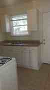 -Cozy galley kitchen with granite countertops, gas stove, and refrigerator