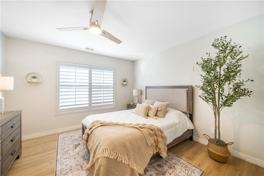 Both bathrooms are tastefully upgraded, including a spacious primary suite with a beautifully tiled walk-in shower and dual-sink vanity. The home is finished with light flooring, modern fixtures, and stylish touches throughout.