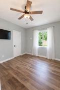 The property's open-concept living area is inviting, highlighted by a ceiling fan and modern lighting. The kitchen, complete with a breakfast bar and stylish cabinetry, provides a functional space for cooking and entertaining. Durable wood-like flooring flows throughout, and both bedrooms enjoy ample natural light, with one offering direct access to the outdoors.