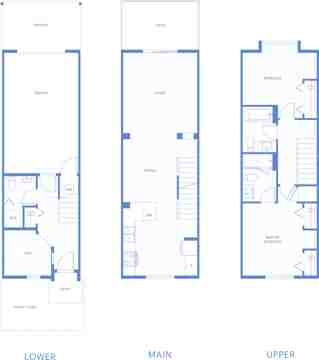 Two big bedrooms up top, with space for a king-sized bed in the master. An open main floor, with end kitchen and oversized windows. A den below with powder room, plus parking for two cars – one in and one out.