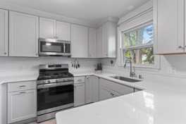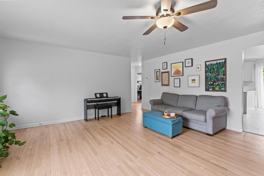 The living room's large window floods the room w/ natural light & illuminates hardwood floors that extend through the main living area & bedrooms. The remodeled kitchen dazzles w/ tile floors, ceiling-high cabinets, quartz countertops & new stainless-steel appliances. The breakfast bar & adjacent dinette area (with a sliding glass door leading to fenced backyard!) offer an ideal space for entertaining guests. The bathroom has also undergone a stunning refresh, showcasing a subway-tiled shower/tub, and a sleek vanity.