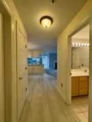 The second bedroom also features LVP flooring, natural light, neutral colors, and a ceiling fan, making it ideal for guests or a home office. The second bathroom is equipped with tiled flooring, a walk-in shower, vanity mirror, and ample drawer and cabinet space.