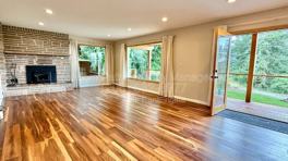 Enjoy elevated North Idaho living in this beautifully refined lakeview home offering a 2-bed/1-bath main residence plus a completely finished 1-bed/1-bath guest suite with its own kitchenette. Thoughtfully renovated throughout, this property blends rich natural finishes with upscale modern touches. The main living area features true hardwood flooring, recessed lighting, and oversized picture windows that frame captivating views of Lake Coeur d’Alene. A wood-burning fireplace with stacked-stone surround adds warmth and character. The gourmet kitchen is appointed with live-edge granite countertops, a large center island, stainless steel appliances, full tile backsplash and pendant lighting – all perfectly positioned to capture the lake view through the kitchen windows and French doors. The dining area sits just off the kitchen and enjoys wrap-around windows overlooking the water and backyard garden area. Step outside to a full-length cedar deck with cable railing for unobstructed views, perfect for relaxing or entertaining. The primary bedrooms are spacious and updated with natural light and new carpet. Downstairs, the guest suite includes luxury vinyl plank flooring, butcher-block kitchenette, modern fixtures and a stylish full bathroom – ideal for guests, in-laws or extended stays. Additional amenities include a separate laundry room with custom built-in shelving, fenced garden space, and private wooded surroundings. Located minutes to the lake and only a quick drive back into town, this home offers both convenience and a true elevated retreat.