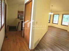 The large primary suite includes a walk-in closet and an ensuite bathroom with dual sinks. Additional highlights include double-pane storm windows, a two-car garage, a sprinkler system, and a spacious 400 sq. ft. deck. Washer and dryer are included. This is a No Smoking and 1 Pet Negotiable Property. Applications are accepted only through McNally Property Management.