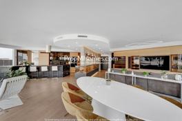 This chef-worthy kitchen will leave you speechless. A massive black-leathered granite waterfall island anchors the space, perfect for prep, casual meals, or hosting. Custom cabinetry, under-cabinet lighting, and upscale finishes define both function and design. The open layout ensures stunning city views from every angle. Your appliances include a built-in Wolf oven, electric cooktop, integrated refrigerator/freezer, dishwasher, and microwave—all seamlessly tucked into sleek custom cabinetry.