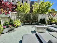 Executive spacious residence with large picture windows, light-filled with 10-foot ceilings, and new hardwood floors. All new appliances in the kitchen, in-unit washer and dryer. The master suite is large enough for an office area. Large walk-in closet. Private wraparound lush garden, accessed from all rooms, equipped with barbecue, fire pit, solar lighting, heat lamps, ample seating - perfect for year-round outdoor enjoyment. One car deeded parking space with interior access. Private storage unit. Furnished, including dishes and linens, or can be delivered unfurnished.