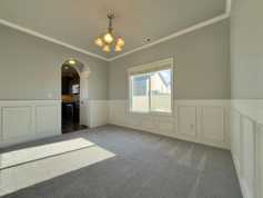 * Open-Concept Living: A large, inviting living room features a cozy fireplace and elegant wainscoting, flowing seamlessly into the entryway and kitchen.