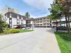 Inside, you’ll find elegant hardwood floors, convenient elevator access, and secured garage parking for one vehicle. The inviting living room features a cozy fireplace and sliding doors that open to a private balcony with stunning views. The modern kitchen offers sleek white cabinetry, a movable island with a breakfast bar, and stainless steel appliances.