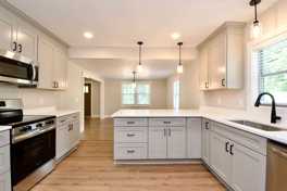 The interior boasts warm-toned flooring, fresh neutral paint, and a sleek black-accented fireplace that gives the living space a stylish focal point. The open-concept kitchen stuns with stainless steel appliances, quartz countertops, soft-close cabinetry, and modern pendant lighting—perfect for cooking, gathering, or unwinding after a long day.