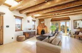 Enchanting Adobe Home with Mountain Views and Artful Craftsmanship Wrapped in breathtaking mountain views and nestled behind secure gates, this meticulously crafted adobe residence blends timeless Santa Fe style with modern comfort. Just 10 minutes from downtown and steps from the Arroyo Hondo Open Space Trail System, this home offers a serene lifestyle surrounded by natural beauty and refined design. Key Features: Authentic Santa Fe Architecture: Enjoy rich regional character with vigas on every ceiling, a classic corner Kiva fireplace, and warm wood or bamboo floors throughout. Flexible Floor Plan: The spacious den—with custom bar, banco seating, and en suite powder room—can be reimagined as a first-floor master retreat for flexible living. Primary Bedroom Sanctuary: Located upstairs, the suite features two private decks facing east and west, offering layered mountain vistas and spectacular skies from sunrise to sunset. Custom Storage: Thoughtful design includes extensive custom wooden cabinetry, offering abundant, stylish storage throughout the home. Indoor-Outdoor Living: Dine al fresco in the enclosed kitchen garden/patio or unwind beneath the stars on the adjoining deck, complete with a private hot tub. Modern Comforts: Climate Control: Stay cool year-round with five efficient mini-split A/C units. Spacious Open Layout: The kitchen, dining, and living spaces flow effortlessly together, perfect for relaxing or entertaining. Unmatched Setting: Exclusive Location: Located just 10 minutes from the heart of Santa Fe, yet offering complete tranquility within a gated community. Direct Trail Access: Step outside and connect directly to the 87-acre Arroyo Hondo Open Space Trail System, ideal for nature lovers and outdoor enthusiasts.
