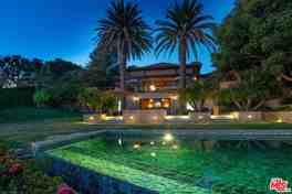 With breathtaking views, Bali-inspired design, and every contemporary comfort, this magnificent estate is a serene sanctuary for exquisite living and impressive entertaining. The private, gated property of over 1.2 acres extends from PCH to Malibu Road, perfectly landscaped and commanding expansive ocean views. A long palm-lined drive leads past a two-story, two-bedroom guesthouse, a lighted north-south tennis court and pavilion, and a fountain, waterfall, and gardens before arriving at the enormous motor court and four-car garage. A dramatic gateway and long, serene palm-lined reflecting pool lead between the wings of the U-shaped house to the gorgeous double-door entry. With interiors designed by Martyn Lawrence Bullard and stunning sight-lines to the ocean, the house is detailed with ornate wood carving, very tall beamed ceilings, wood and stone floors, and full-width exterior doors that vanish to offer seamless flow between indoors and out. The entry steps down to the formal living room, which includes a generous dining area, a pair of facing fireplaces, and a wall of glass that opens onto a roomy patio with a fireplace, stunning ocean view, and a nearby fountain and barbecue island. Adjoining the living room is a spectacular ocean-view great room that includes a family room with fireplace, dining area, and a gourmet kitchen with a huge stone-topped island with seating, deeply recessed tray ceilings, beautiful cabinetry, and a pantry. One wing of the house has two bedrooms and a laundry room. The other wing features a majestic ocean-view owner's retreat with high wood beamed ceilings, beautiful wall coverings, wood floors, and a wide glass doorway opening to a tranquil covered patio. A hallway leads to a luxurious bath, two very large closets/dressing areas, and, at the end of the hall, a resplendent Bali-inspired library/study with high coved ceilings, a wall of built-in book shelves and cabinets, a fireplace, and doors to the patio and to a private sitting area. The home's lower level features a party-perfect bar room highlighted with ornate metalwork that encloses a large wine storage area. The bar extends into a spacious tiered home projection theater. A long hallway leads to a second powder room, a changing room, and another bar, which opens to the lower patio, spa, sitting areas, and lawns, as well as the infinity ozone pool, patio, cabana, and private steps to Malibu Road and access to the beach/ocean. With Crestron electronics and full-house water filtration, this remarkable estate is a livable legacy.