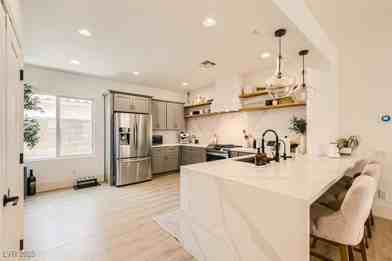 This beautifully updated single-story home offers 3 bedrooms and 2 full baths, designed with timeless elegance and modern finishes throughout. Located in Anthem Highlands, this home makes a lasting impression from the moment you arrive. Step inside to discover a spacious open-concept layout filled with natural light. Warm luxury vinyl flooring runs throughout the home creating a seamless flow. The kitchen is a true centerpiece, featuring sleek gray cabinetry, quartz countertops that extend up as a full-height backsplash, stainless steel appliances, and an oversized waterfall island with ample prep space and bar seating. Both bathrooms offer a spa-like retreat with custom vanities, modern fixtures, and glass-enclosed showers. The primary suite is a true sanctuary, complete with a freestanding soaking tub perfect to unwind. Outside, enjoy low-maintenance landscaping, a covered patio, and an above-ground hot tub. The oversized two-car garage adds extra storage and convenience.