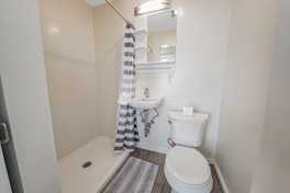 Private en-suite bathroom with shower, toilet, sink, mirror cabinet, and shelves