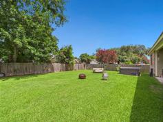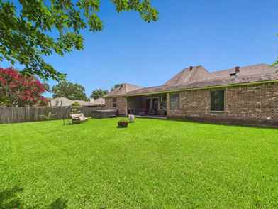 The private primary suite includes a luxurious bathroom with a soaker tub and separate shower. Outside, unwind on the cozy covered patio overlooking a generous fenced-in backyard on a 123' x 140' lot—ideal for gatherings, gardening, or play.