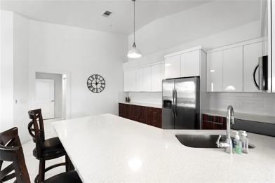 Step inside to a light-filled living space featuring vaulted ceilings, porcelain tile floors, and quartz countertops throughout. The split-bedroom layout is ideal for privacy, with a large primary suite including a walk-in closet and ensuite bath with walk-in shower. The second bedroom and bath are tucked away for guests or roommates.
