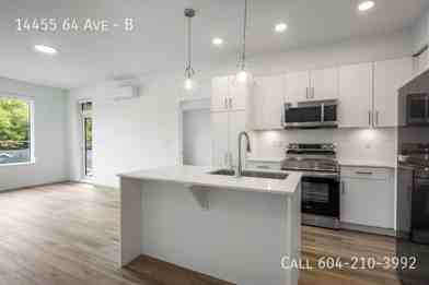 14455 64 Ave #B, Surrey, BC is a 2 bedroom, 2 bathrooms apartment for rent. It is located in the South Newton neighborhood of Surrey. It has apartment amenities including assigned parking, deck, on-site laundry, and fitness center. Cats and dogs are allowed, making it a pet-friendly apartment.