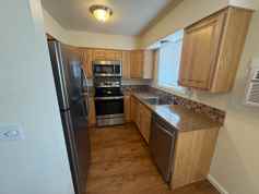 -Kitchen has hickory cabinets and stainless steel appliances (fridge, range, microwave, and dishwasher).