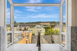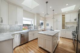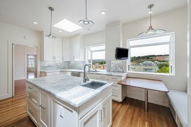 The kitchen features two skylights, an island with its own sink, a breakfast nook with a commanding view of the Presidio, and a GE Monogram gas range with double oven, four burners and two grills with covers.