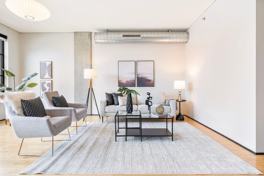* High ceilings, expansive windows, hardwood floors, granite countertops