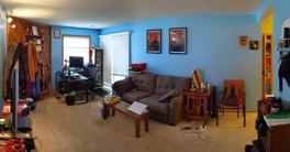 Living room features wood paneling and patio access and kitchen has ample storage space as well as a dining area.
