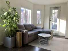 2 Bedrooms (with queen size beds and sliding door closets) • 1 Bathroom (with 2 vanity sinks, bathtub/shower combination) • Open concept Kitchen (with built in fridge, stainless steel dishwasher, stainless steel stove/oven, microwave, dishes/cutlery) • Dining/Family Room Combination (with dining table and chairs, sectional couch, coffee table, rugs, wall mounted TV) • Small patio (with table and chairs) • Entry mudroom with large IKEA PAX storage locker/unit and deep storage closet • In-suite stacker washer/dryer
